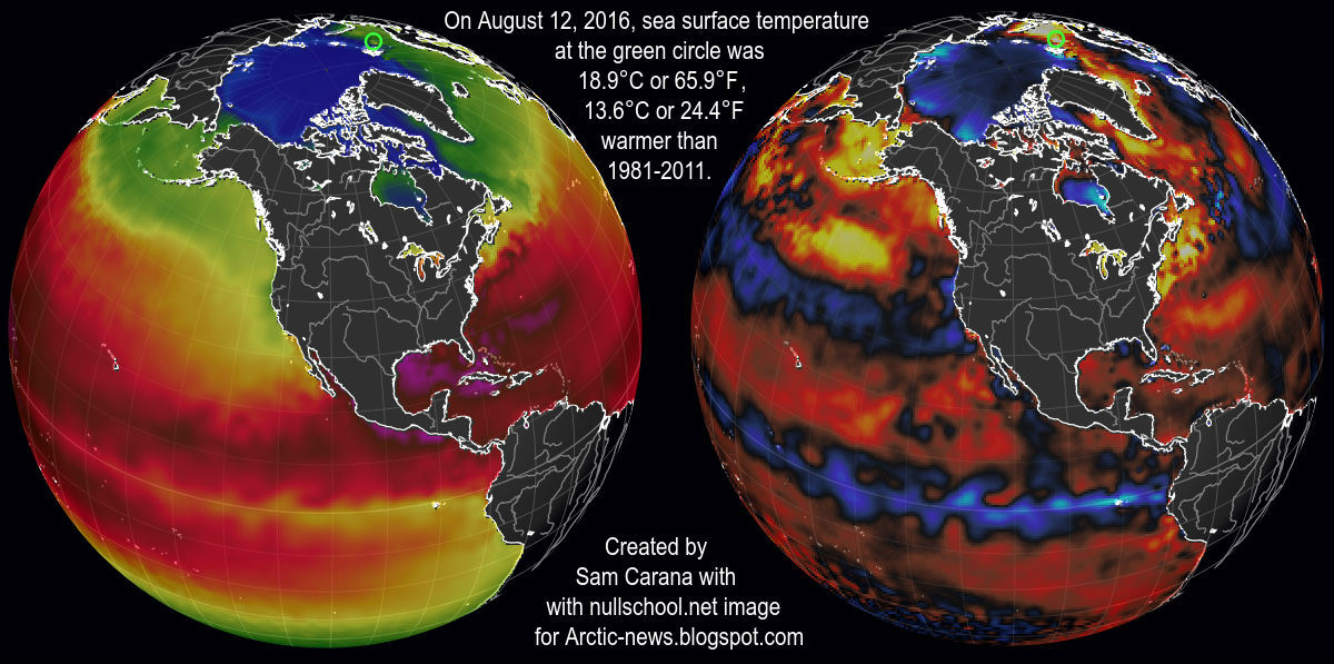 Above image also shows that on August 12, 2016, sea surface temperatures near Svalbard (at the location marked by the green circle) were as high as 18.9°C or 65.9°F, an anomaly of 13.6°C or 24.4°F.